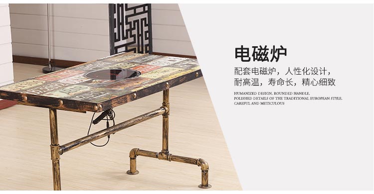 梦达时尚个性火锅桌椅,主题餐厅或火锅桌椅组合,现代桌椅制作工艺,引进现代家具制作技术,表面光滑,采用复古做旧处理,让整款火锅桌椅看起来高端典雅。